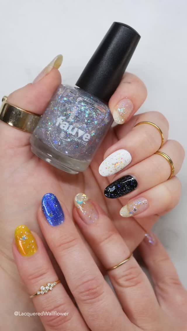 “So, so freaking pretty and sparkly in all lighting situations. I wore it over a white crelly. Can't wait to try this over my other polish. This has gotta be one of my favorite toppers. I did use an orange stick to "fish" out the moons and stars I wanted since those didn't separate from the brush easily.”